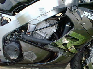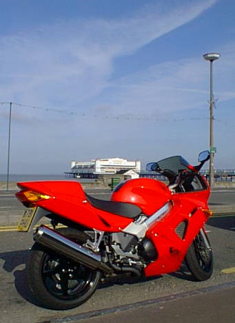 | And the Hornet also had to go. This picture shows the Hornet getting ready to do what it did best—A-road touring. The Hornet was almost certainly the best bike Janet has had to date, and it was a wrench to part with it. However, it had to go if she wanted to just have one bike to run, and she was ultimately ready to move on after nearly five happy years with the Hornet. | ![]() |