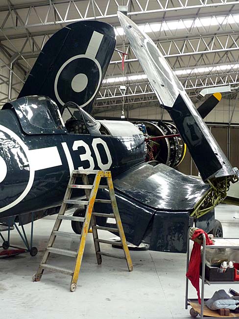 A Corsair naval fighter, of WW2 vintage, in for maintenance
