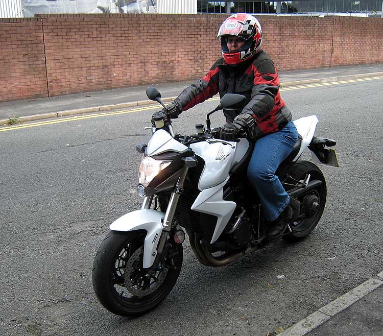The riding position on the new CB is somewhat more aggressive than on my 600 Hornet (and certainly more aggressive than on the Hornet 900 I had before). You feel rather more perched on top of the bike than is usual on a standard. Perhaps Honda were trying for more of a streetfighter feel. In practice it felt part way towards a motocrosser, with a feeling of being right over the tank, but with fairly wide bars. Fortunately though it isn't as tall as a motocrosser—although I do have slightly less foot on the ground than with either of my two bikes, it is certainly enough for me (5'6") to feel in control, even though it is also about 20 kilos heavier than either of my bikes.