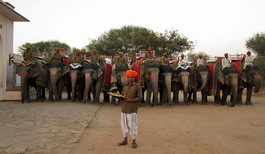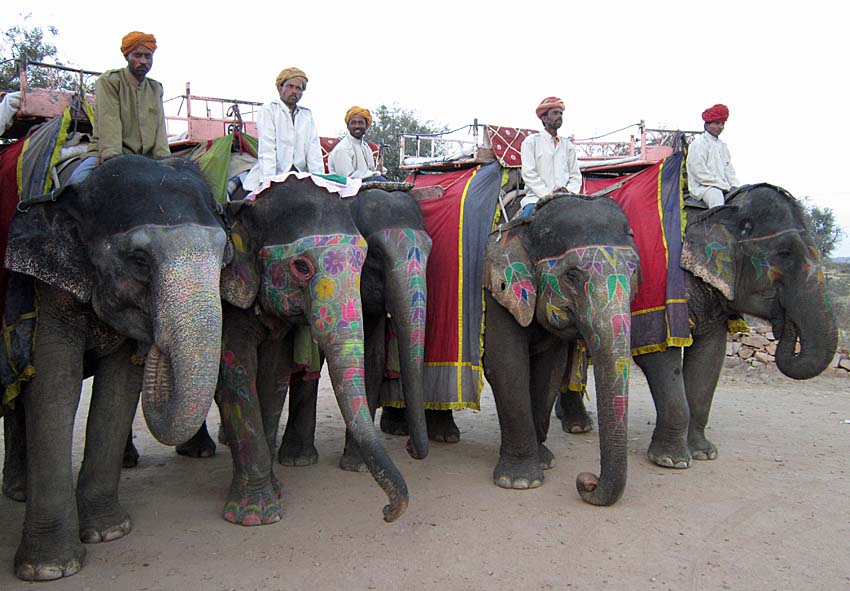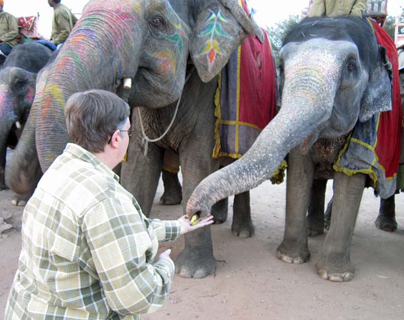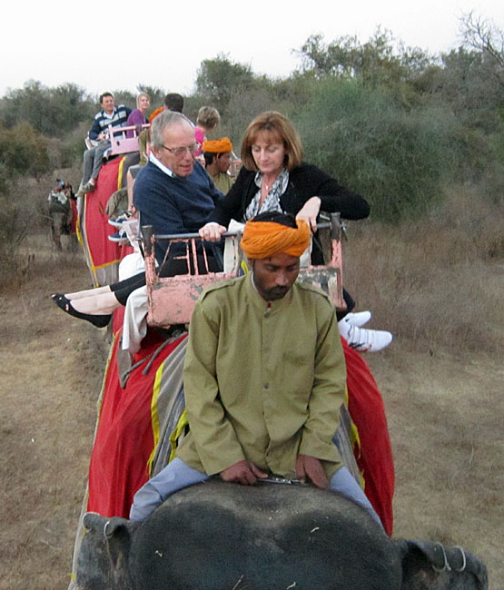 The tour included an evening elephant ride at Dera Amer. Dera Amer is a few miles outside Jaipur, and it was an adventure in itself being driven up the dirt track to the camp in the coach . . . and knowing that we had to make the same trip back, after dark! However, our very capable coach driver took it in his stride, and the whole evening was a lot of fun.