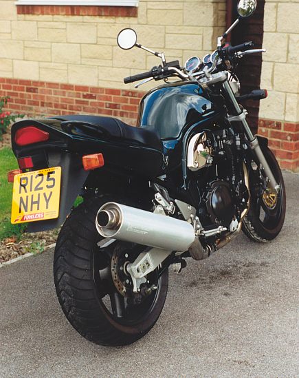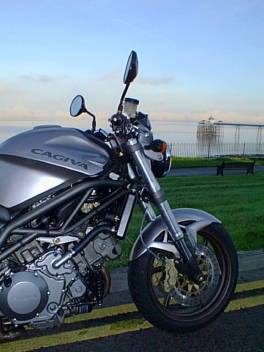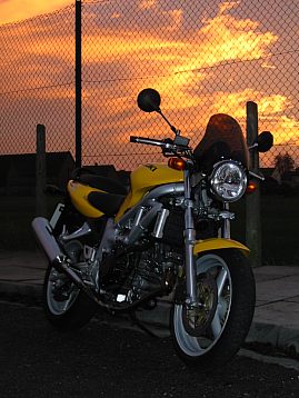 | And the Hornet also had to go. This picture shows the Hornet getting ready to do what it did best—A-road touring. The Hornet was almost certainly the best bike Janet has had to date, and it was a wrench to part with it. However, it had to go if she wanted to just have one bike to run, and she was ultimately ready to move on after nearly five happy years with the Hornet. | ![]() |