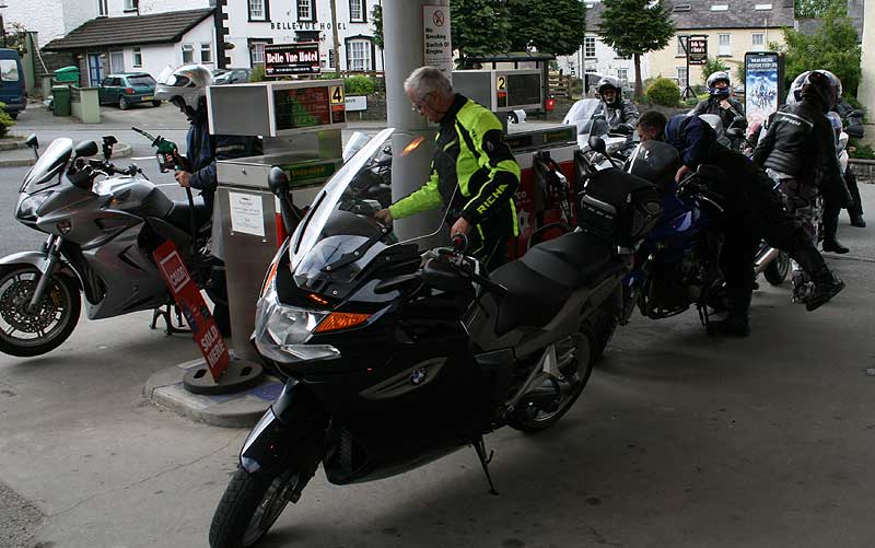 An essential start to a ride-out—a large number of bikes take over a small filling station